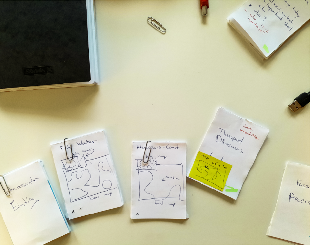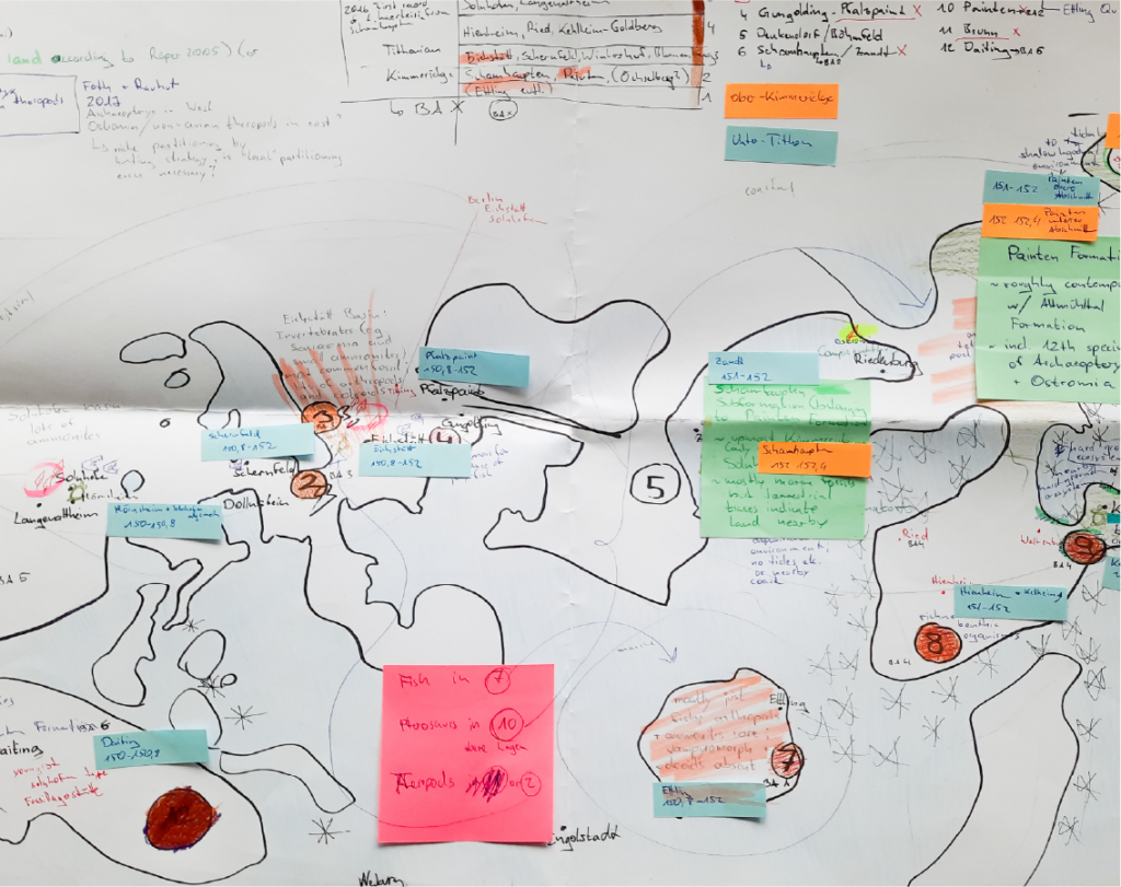 Dazu habe ich auf Grundlage meiner Literaturrecherche eine Karte erstellt, die alle relevanten Fossilfunde, Tiere, Lebensräume und Fundorte in ihrer geografischen Lage zeigt. Zum Beispiel, in welchem Teil der Lagune welche Tiere lebten oder wo Korallenriffe vorkamen.