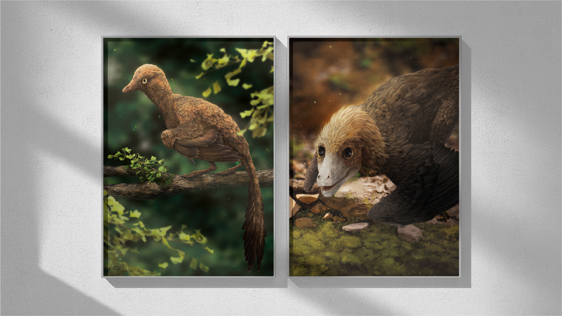 Illustrationen von Archaeopteryx lithographica als Jungtier und Erwachsener – bei der Gefiedergestaltung bleibt viel Raum für kreative Spekulation.