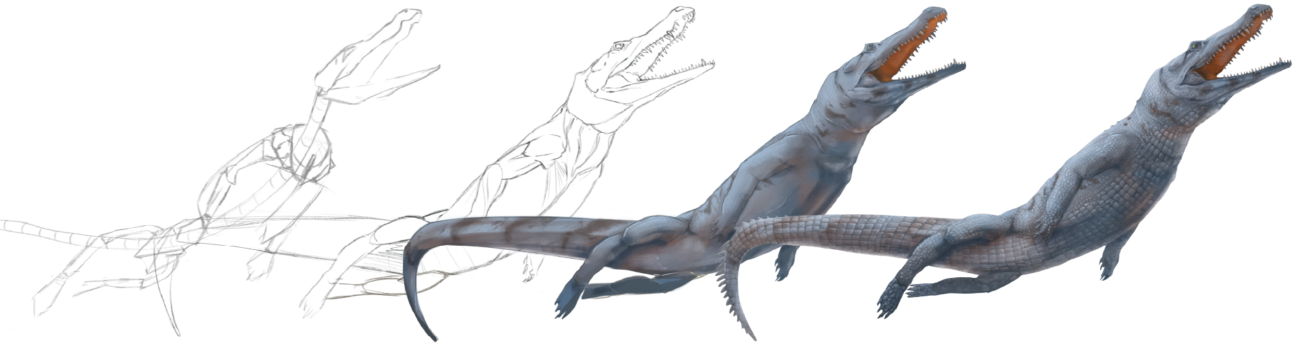 Die einzelnen Schritte sind bei jeder Illustration gleich: Knochenstruktur, Muskeln, ein grobes Farbschema und schließlich die Details.